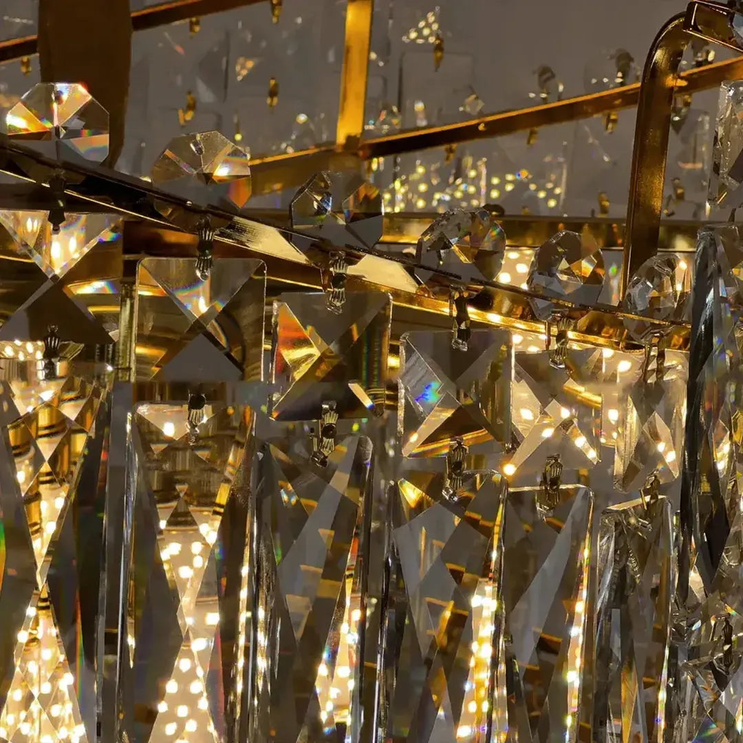 Candelabru cristal topkapi nobile 6xe14, diametru 40cm, auriu lucios, inaltime reglabila este alegerea perfectă pentru cei care își doresc un plus de stil, funcționalitate și lumină de calitate în locuință.