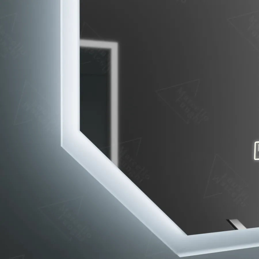 Oglinda led poligon, 60x80cm, hexaluce senzor motionglow marcello, sistem dezaburire, ceas & termometru, dimabila este alegerea perfectă pentru cei care își doresc un plus de stil, funcționalitate și lumină de calitate în locuință.