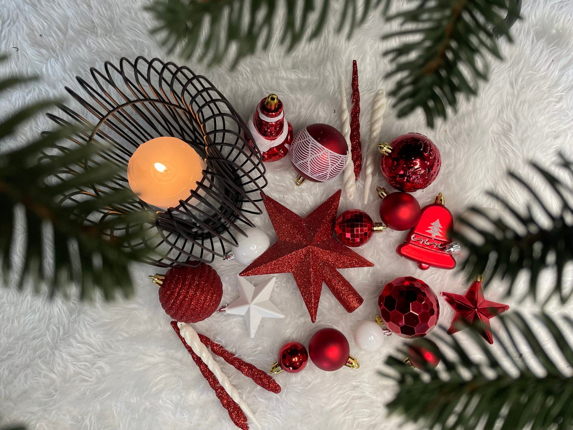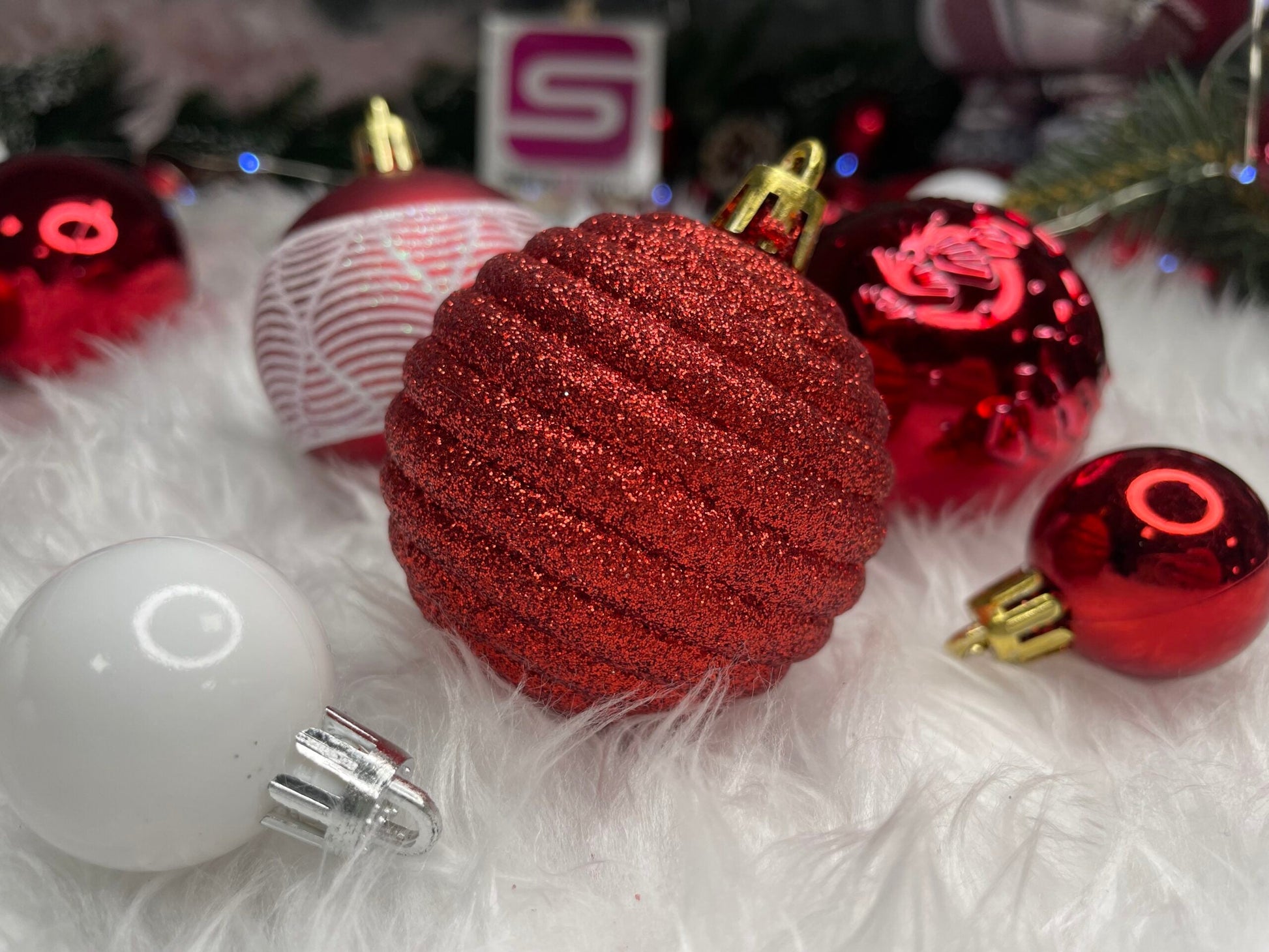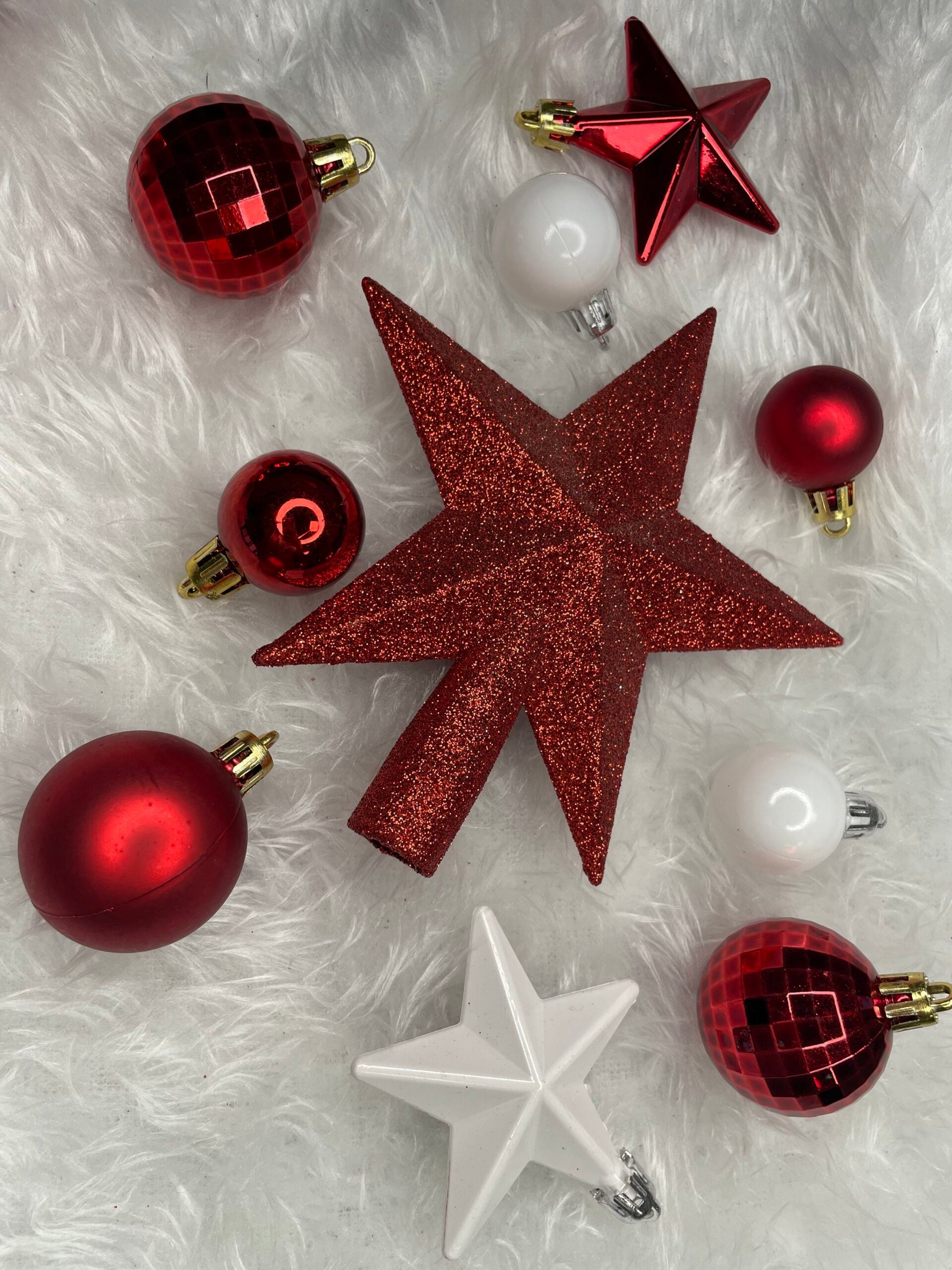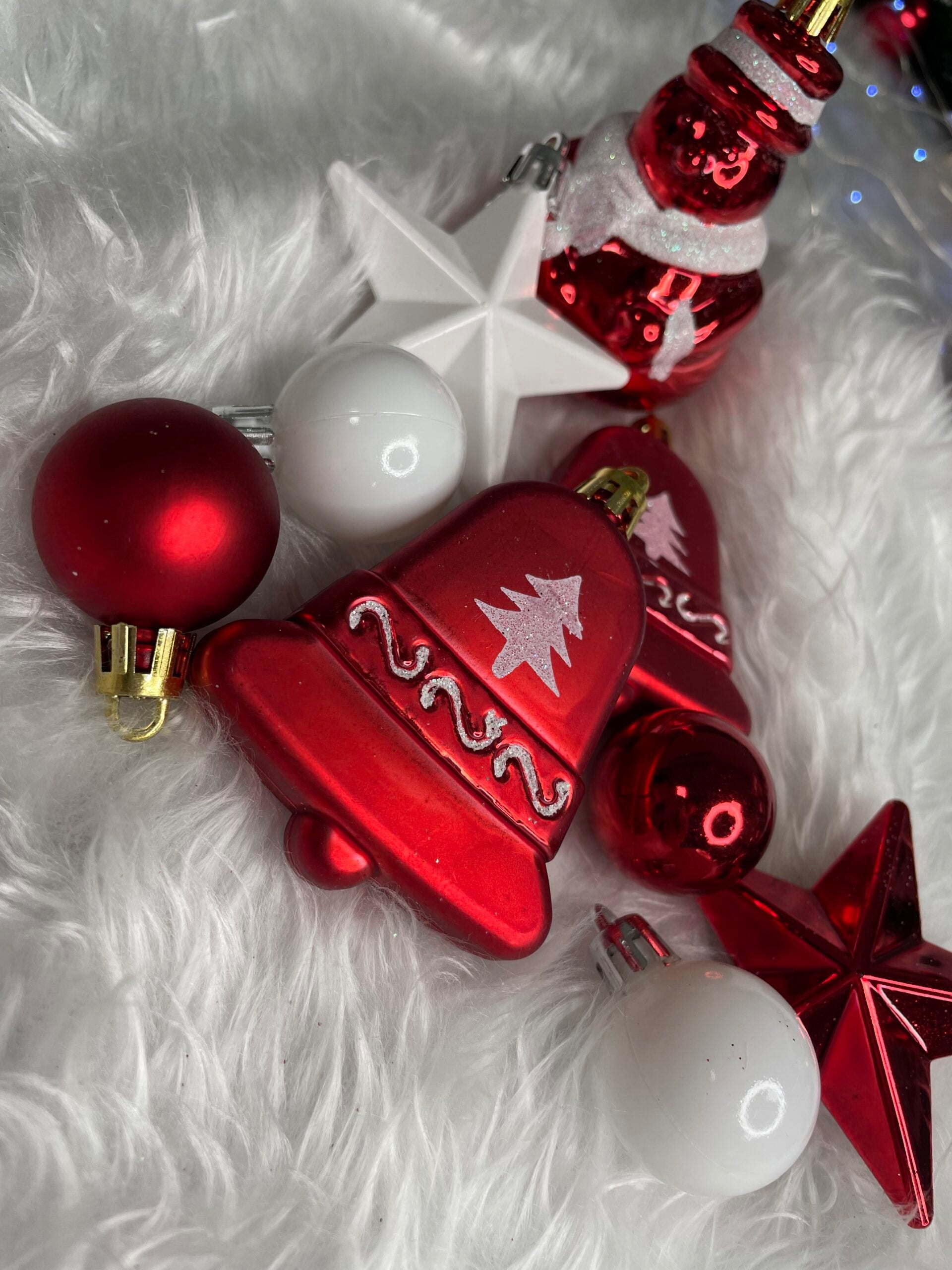 Set globuri si decoratiuni de Craciun, 105 piese, diverse dimensiuni, alb rosu