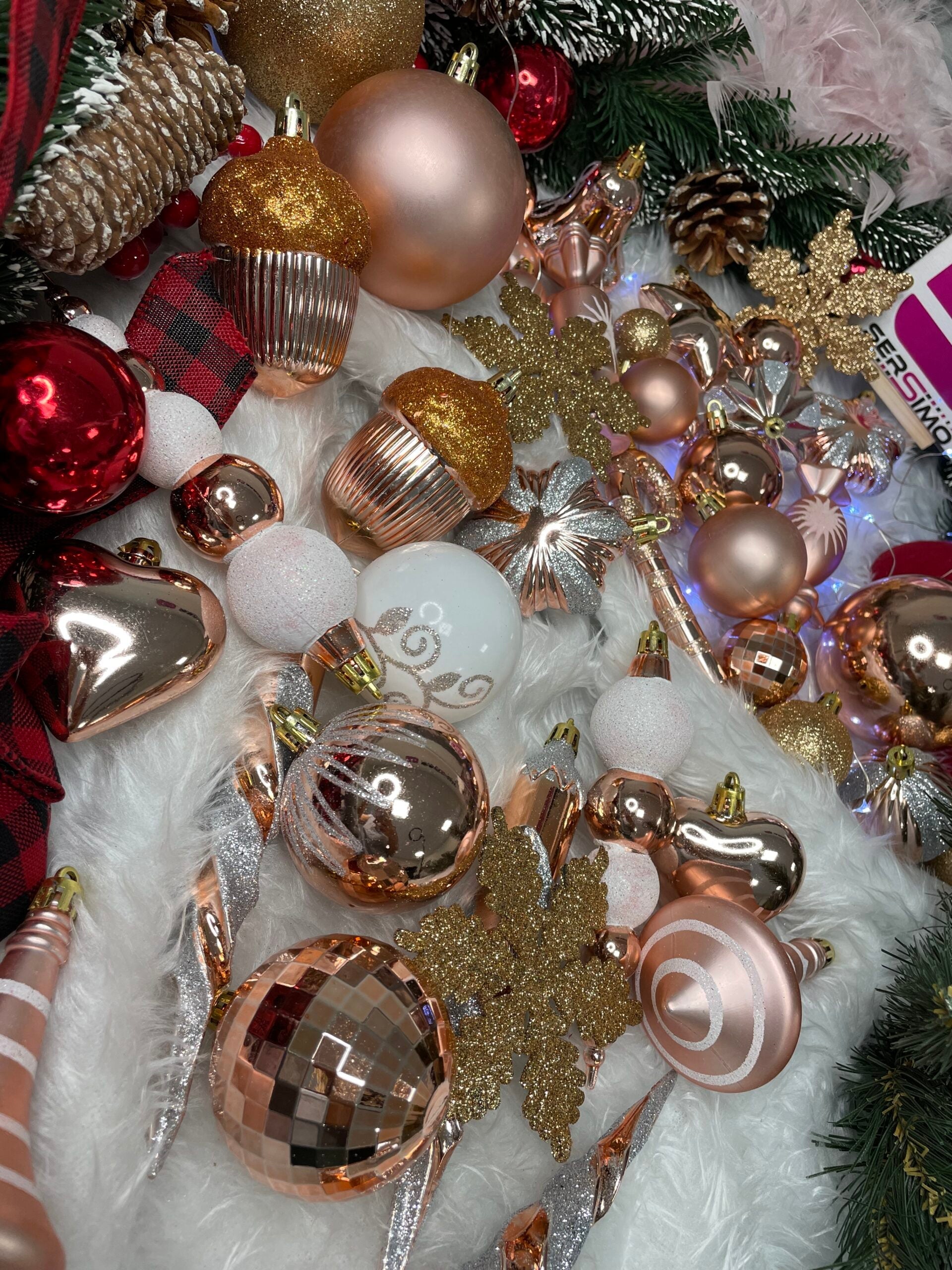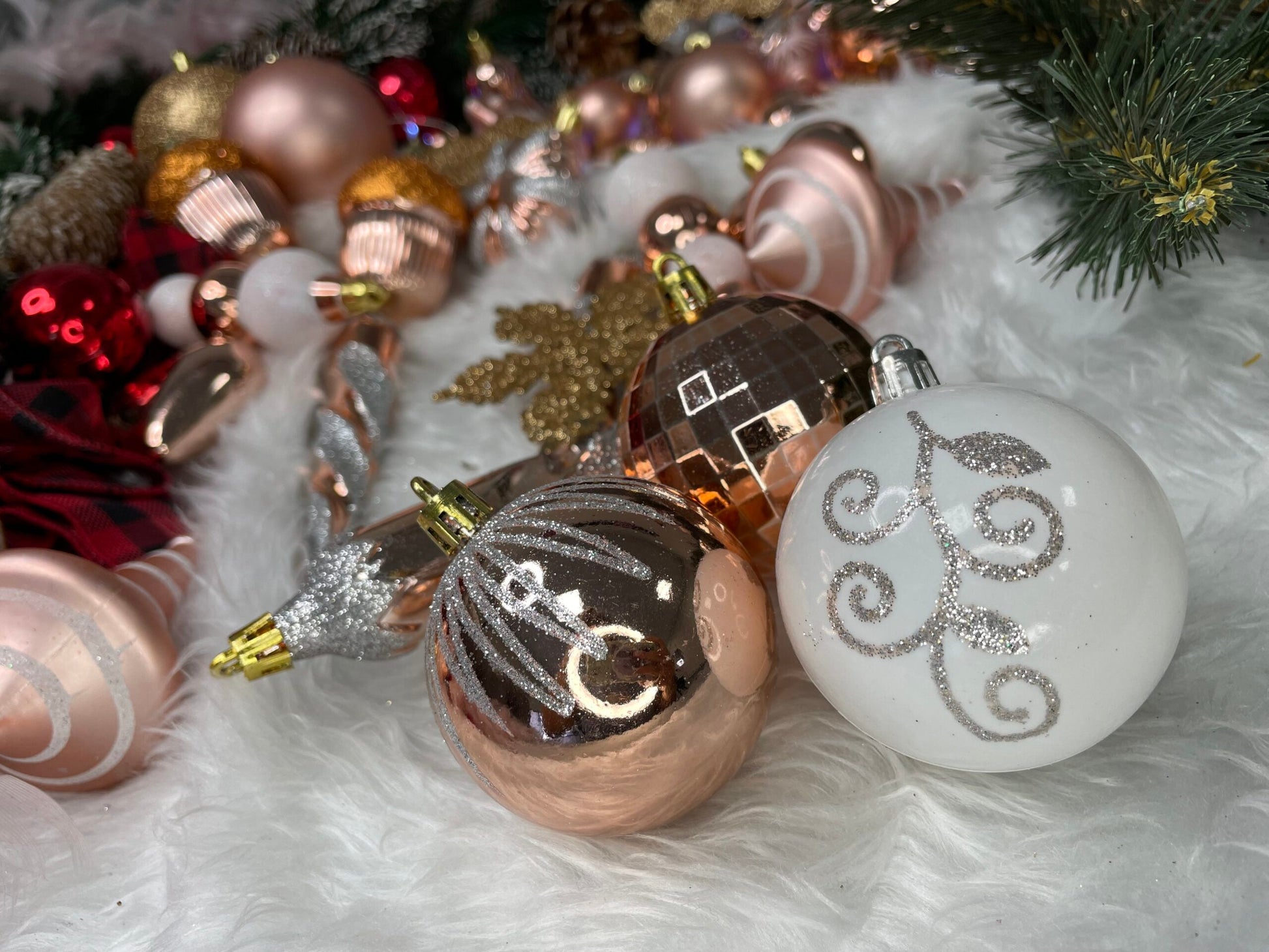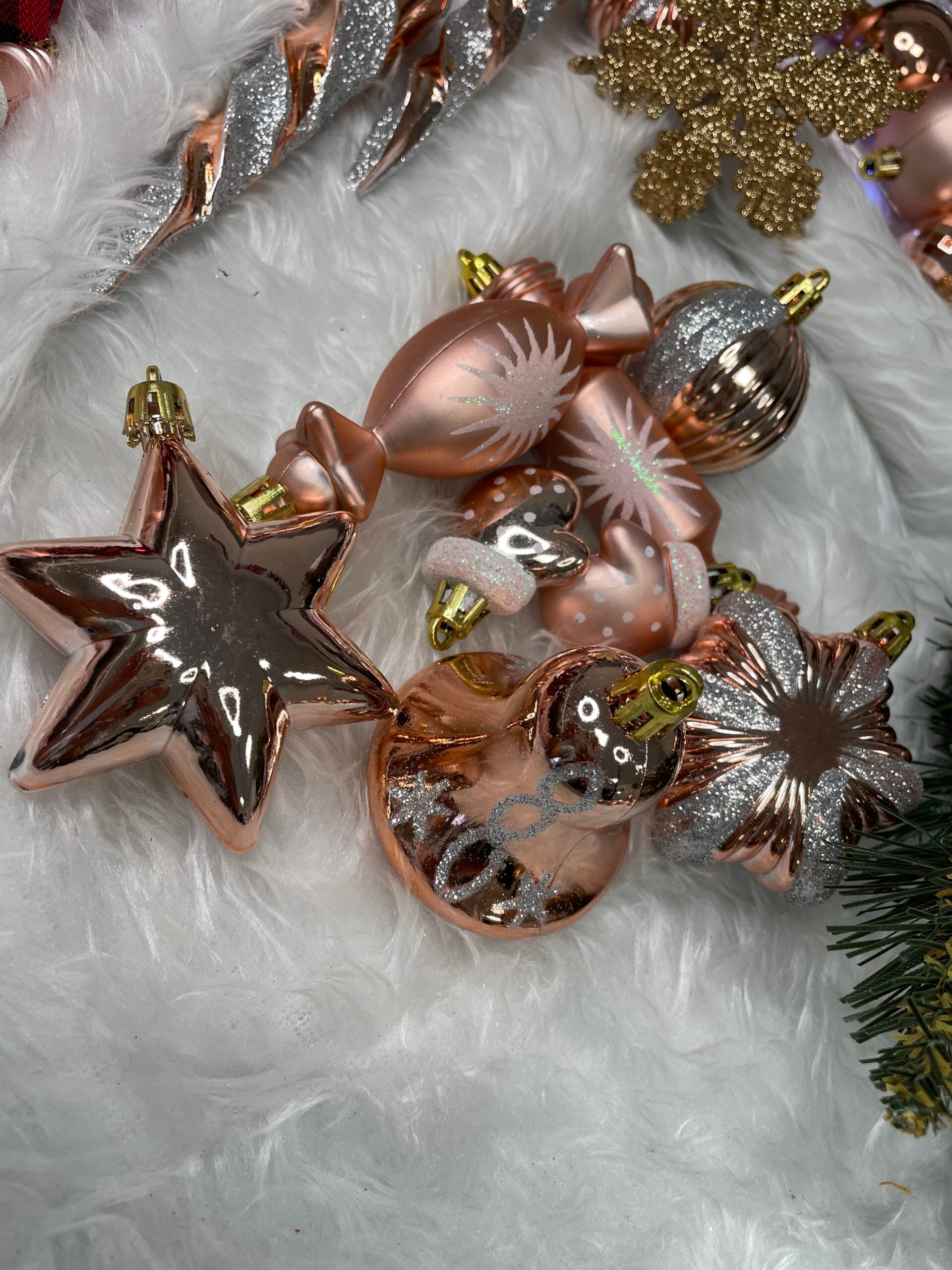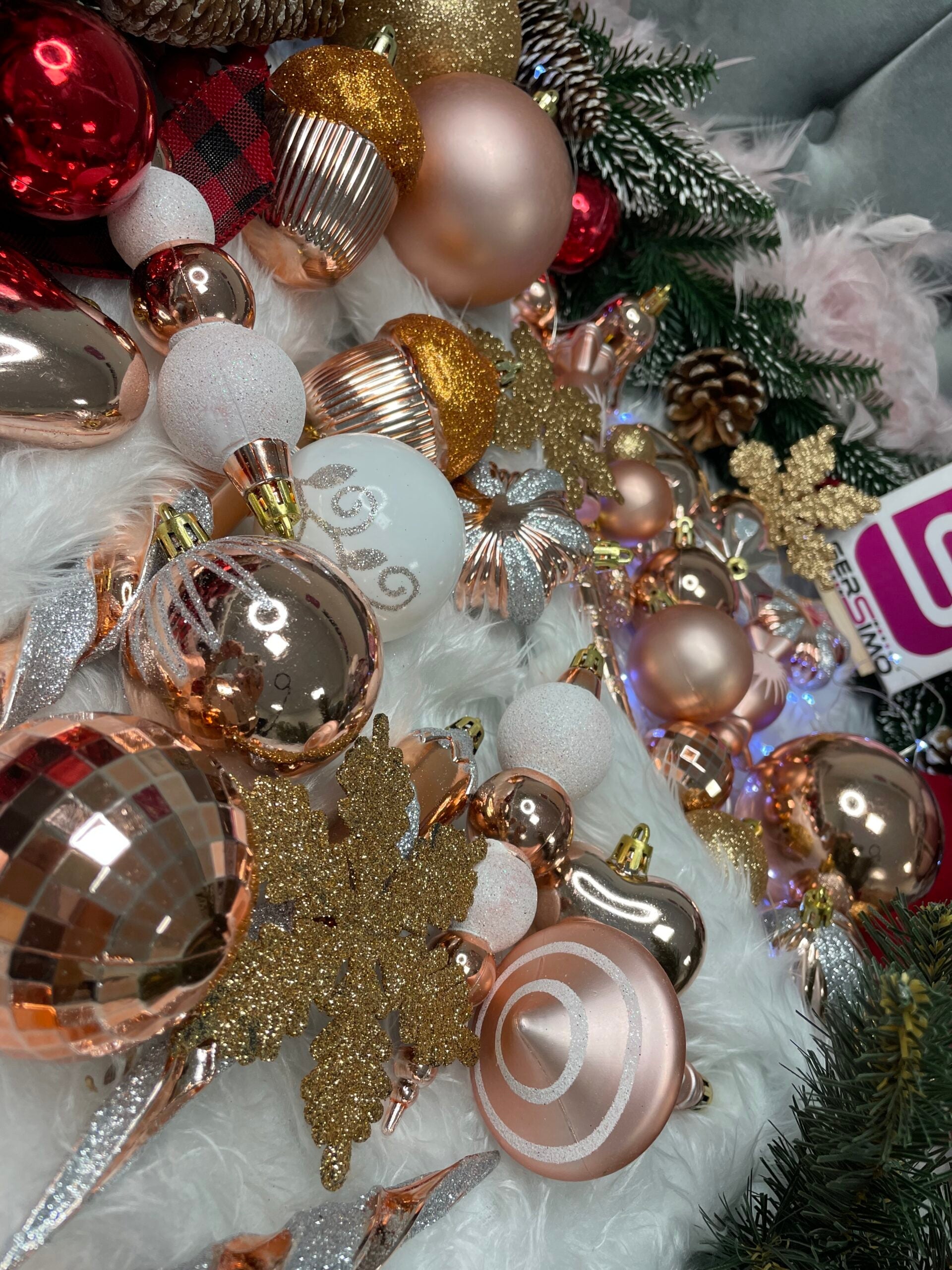 Set globuri si decoratiuni de Craciun, 152 piese, diverse dimensiuni, roz auriu