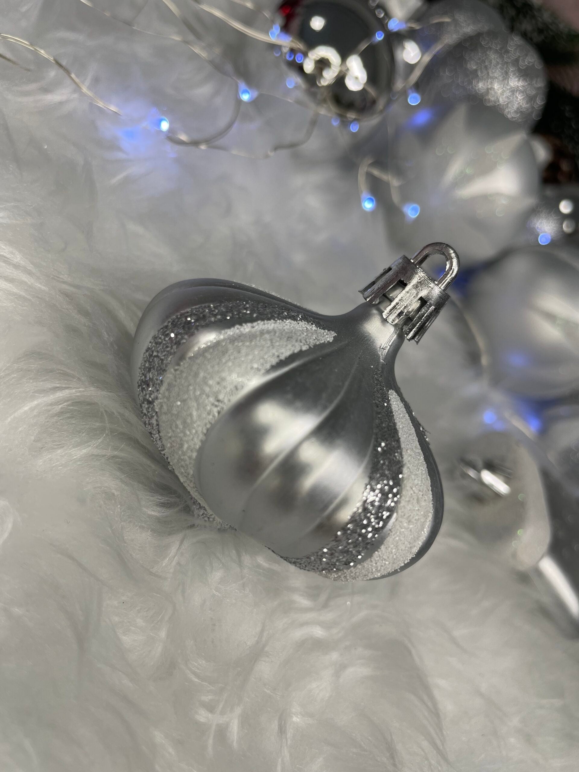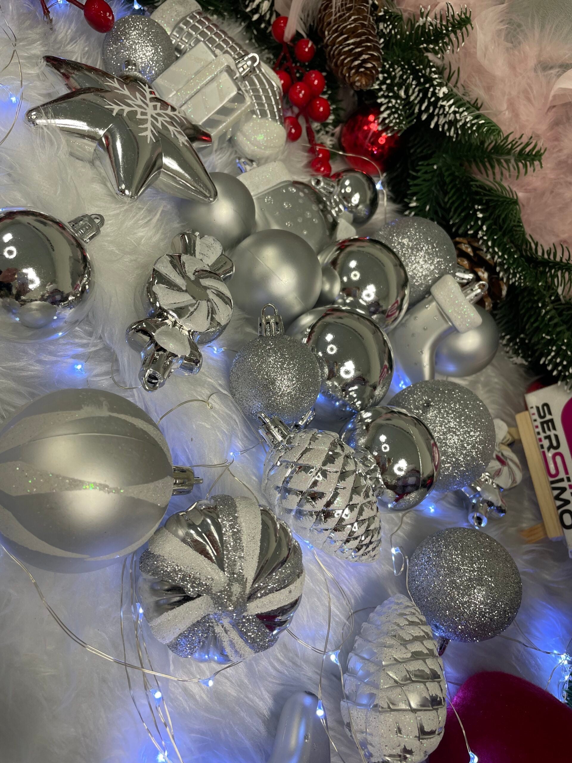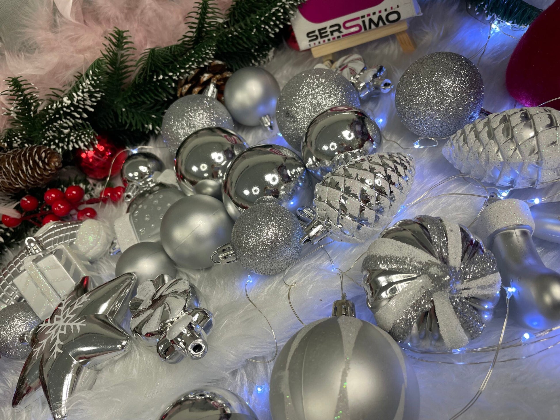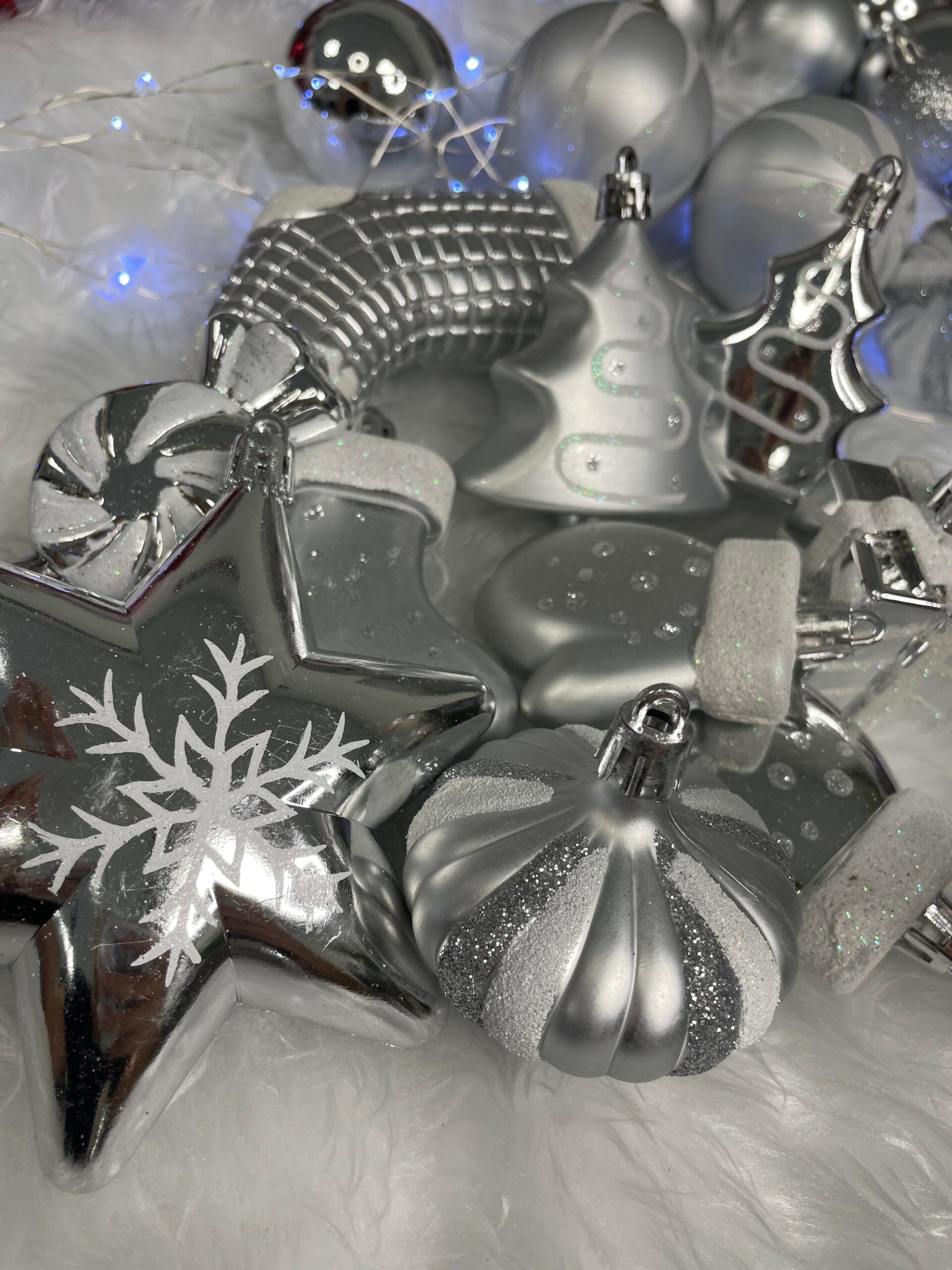 Set globuri si decoratiuni de Craciun, 77 piese, diverse dimensiuni, argintiu
