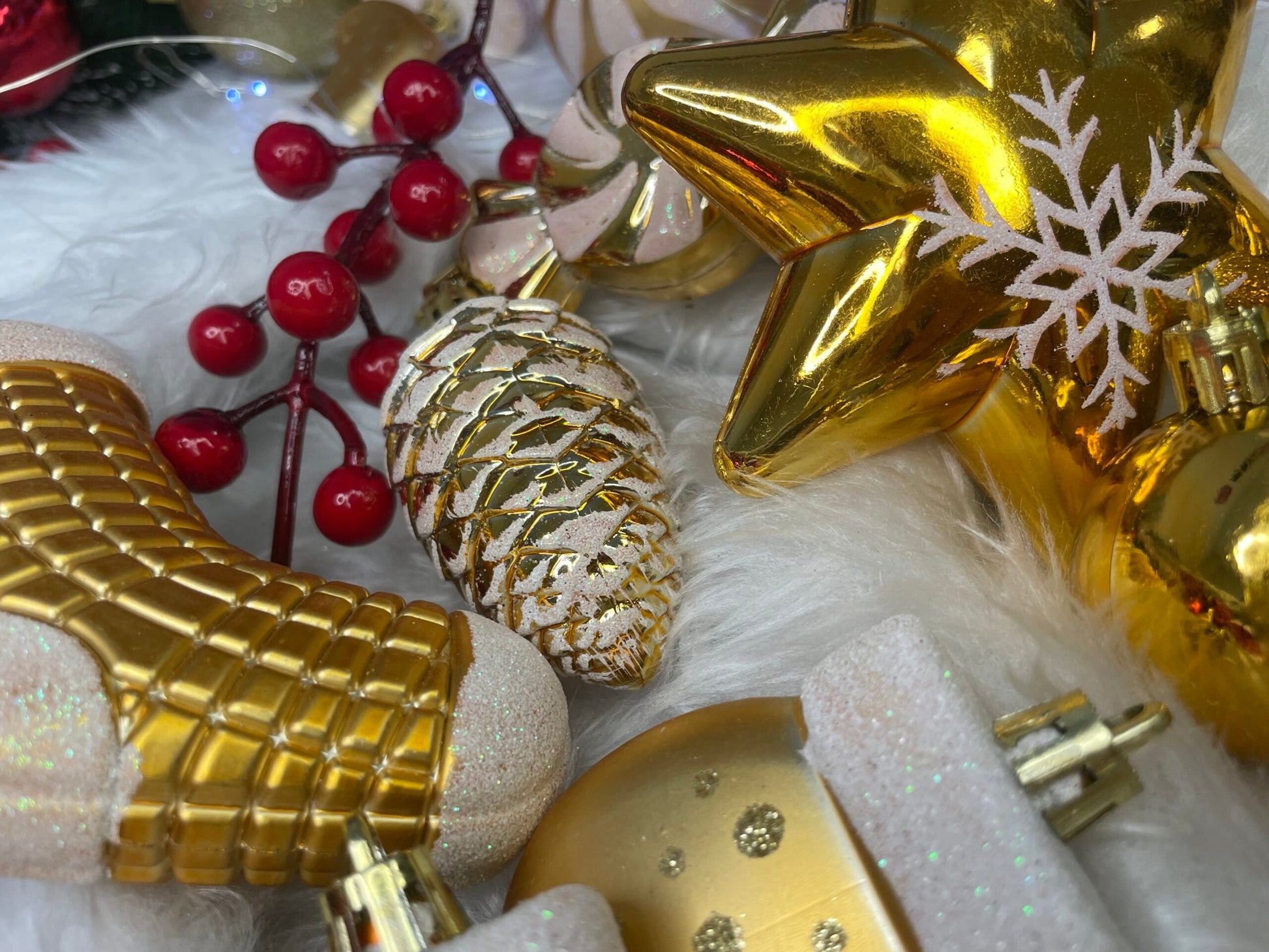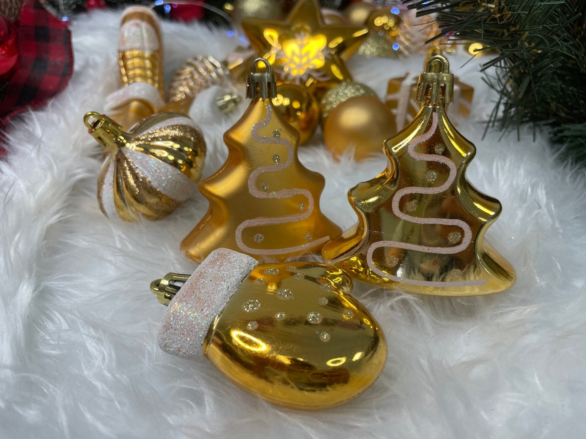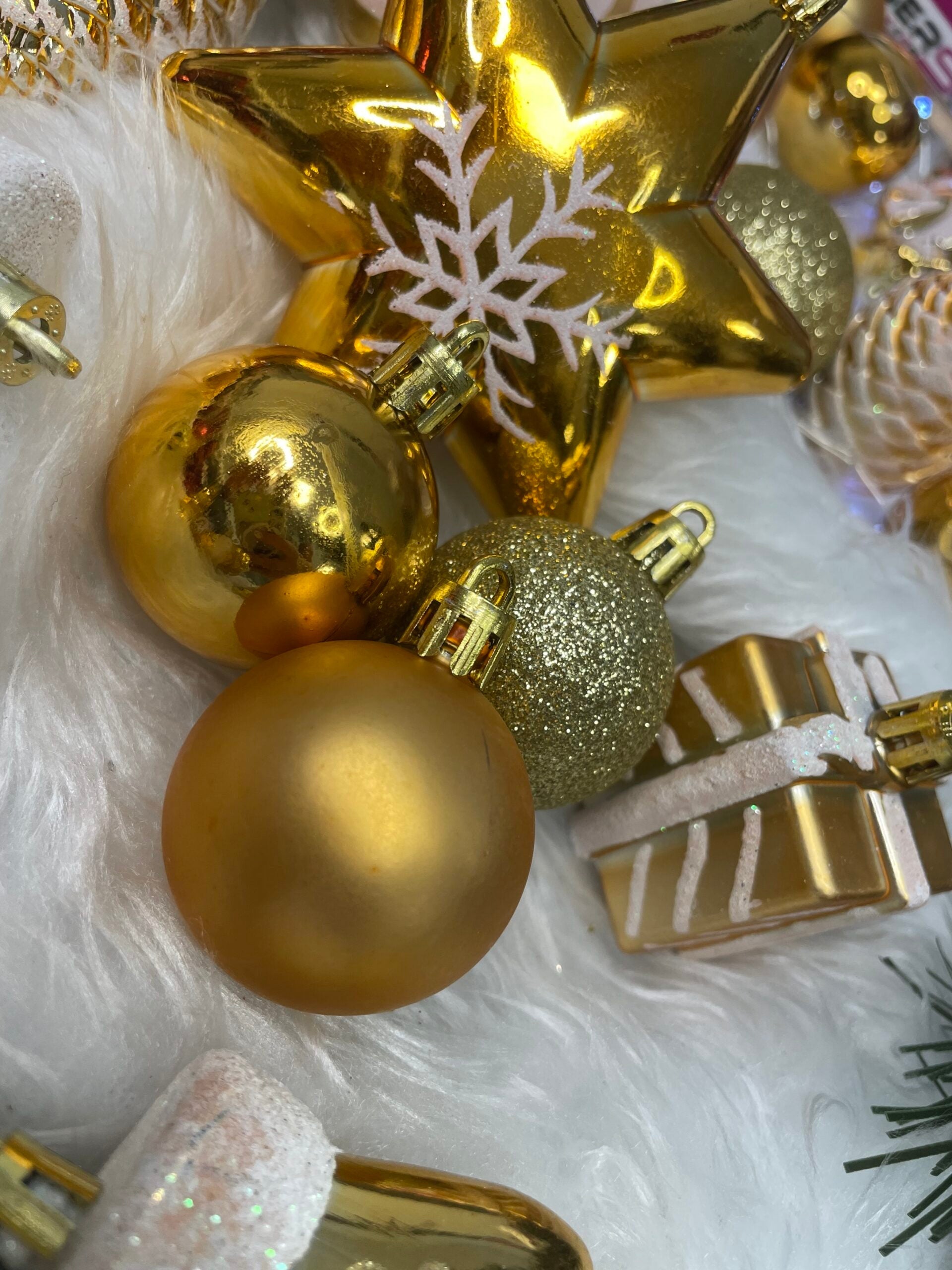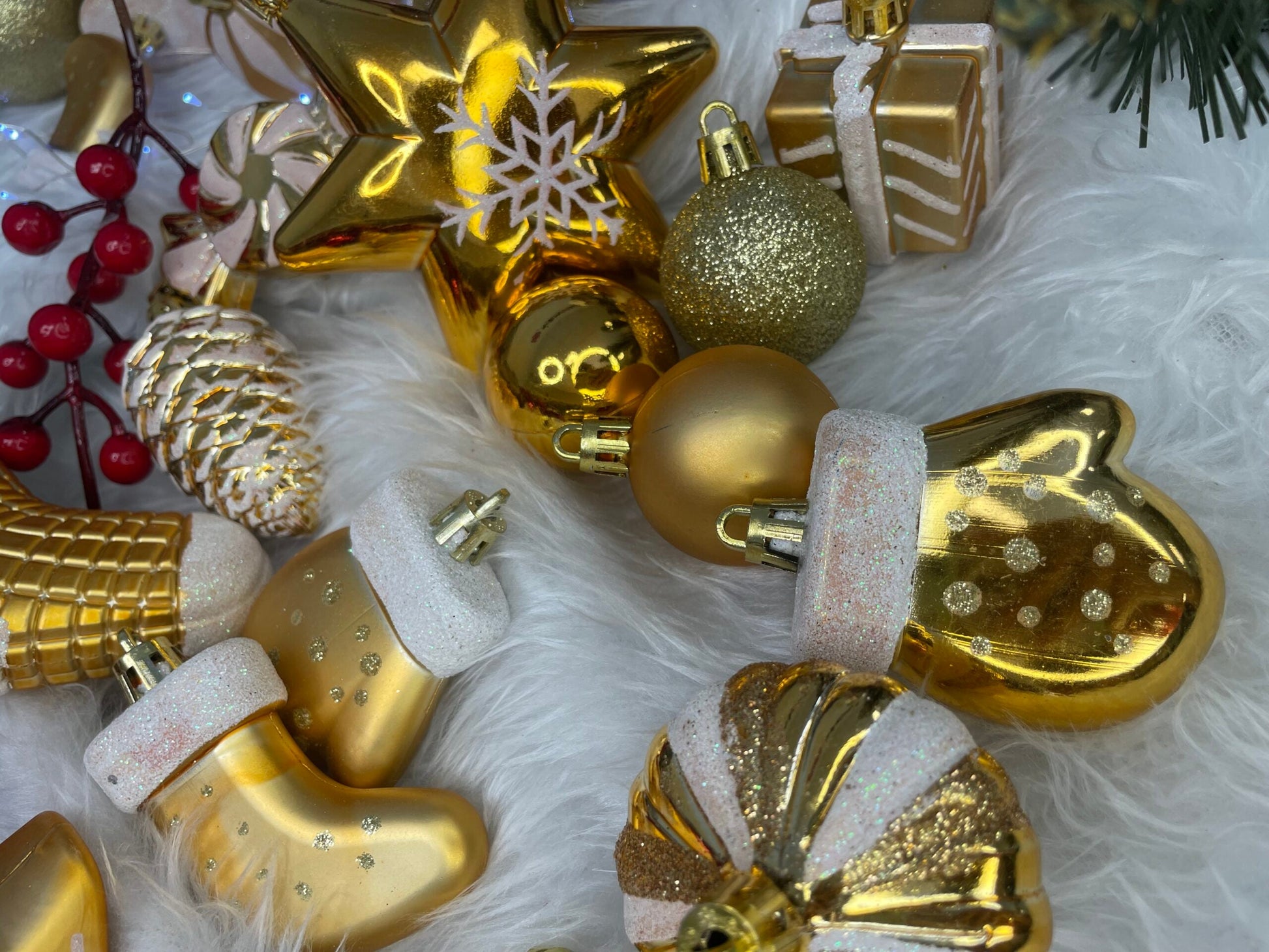 Set globuri si decoratiuni de Craciun, 77 piese, diverse dimensiuni, auriu