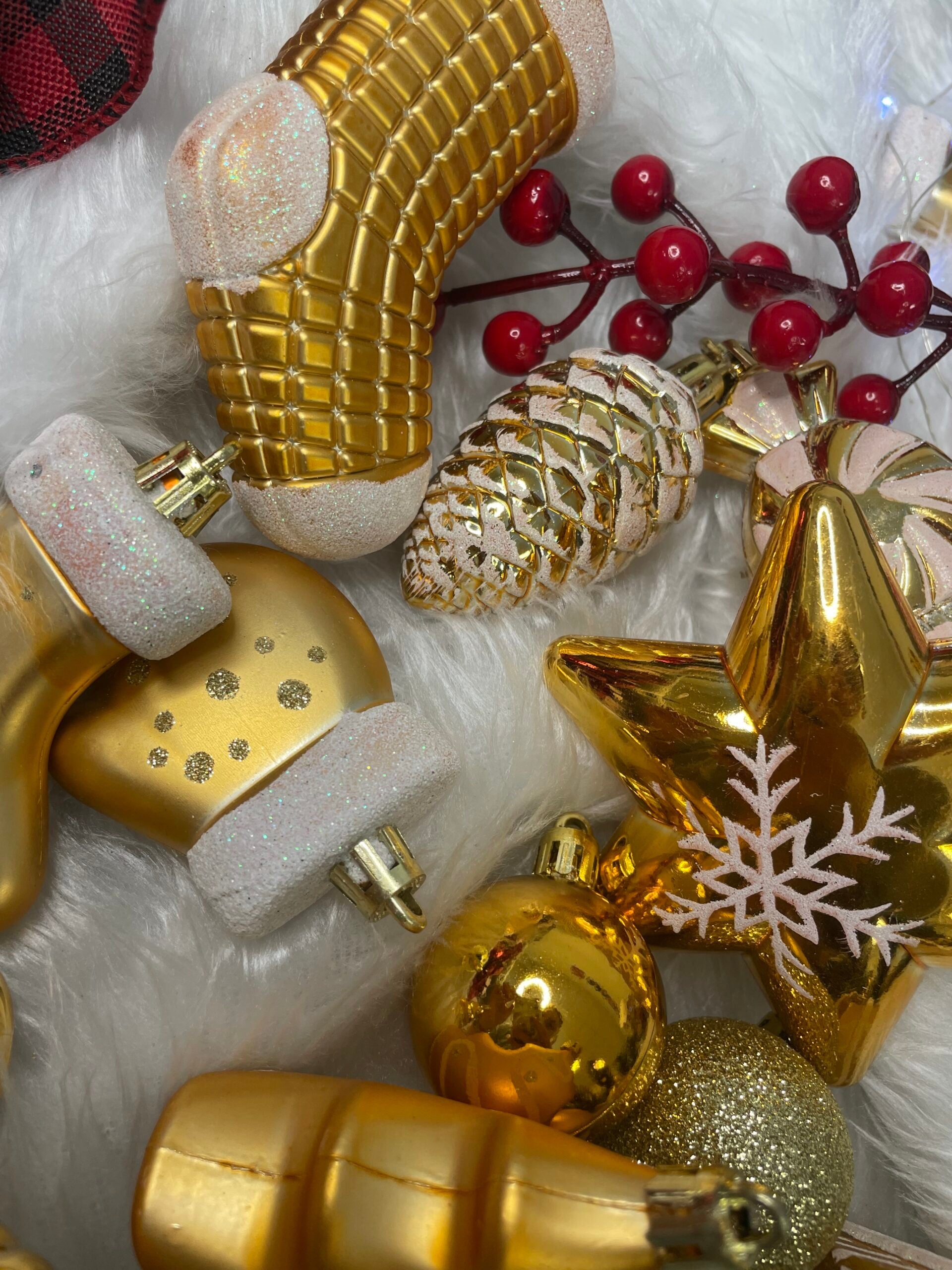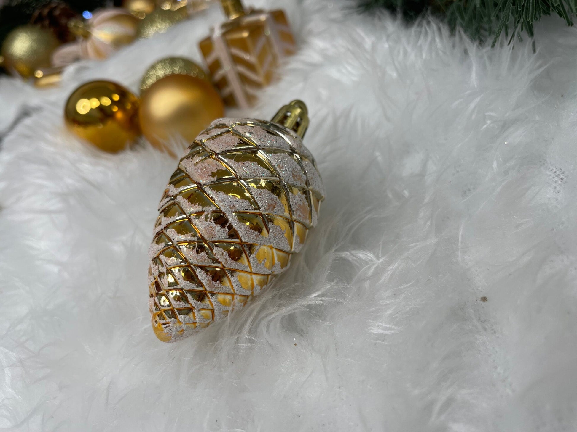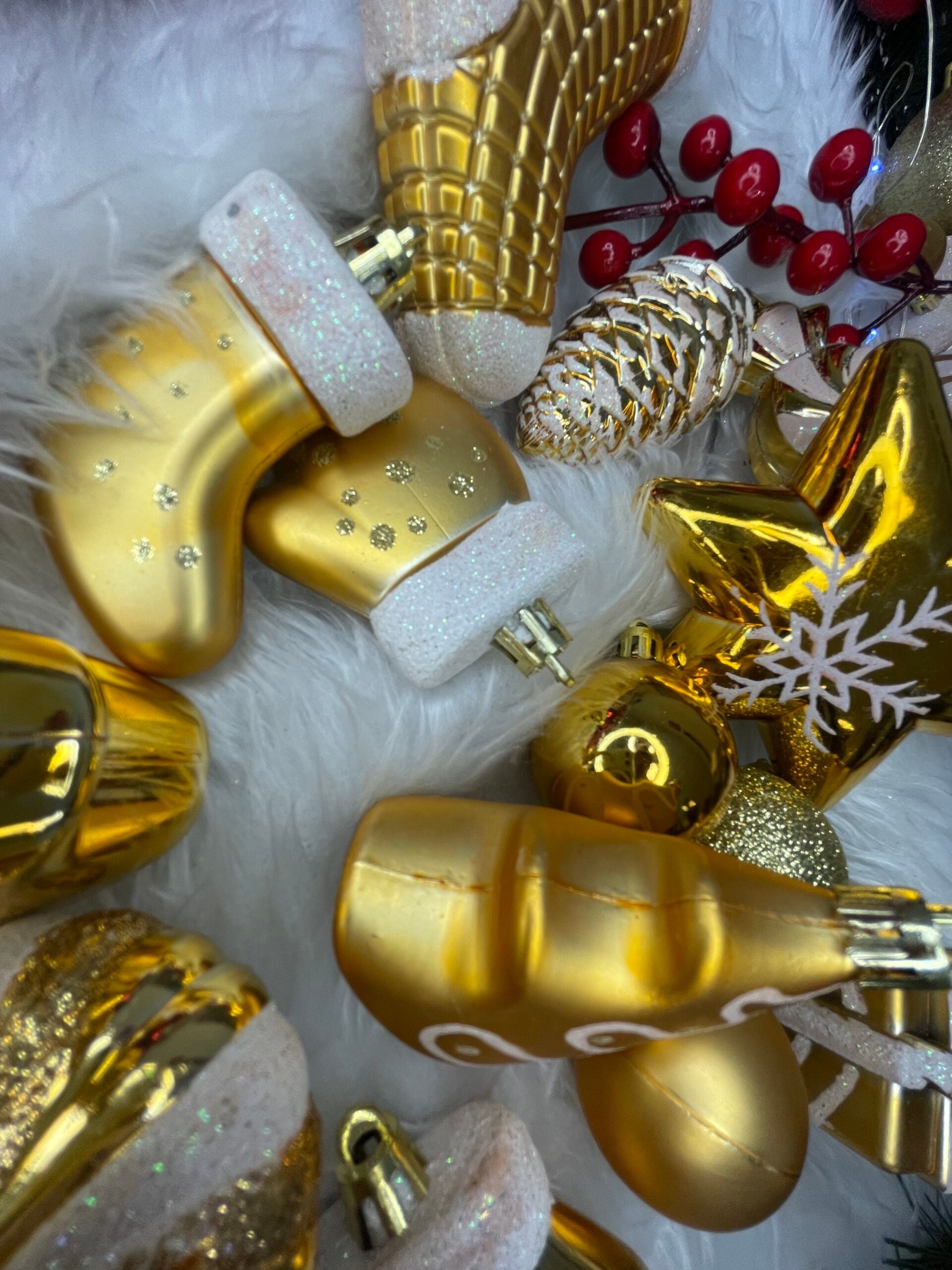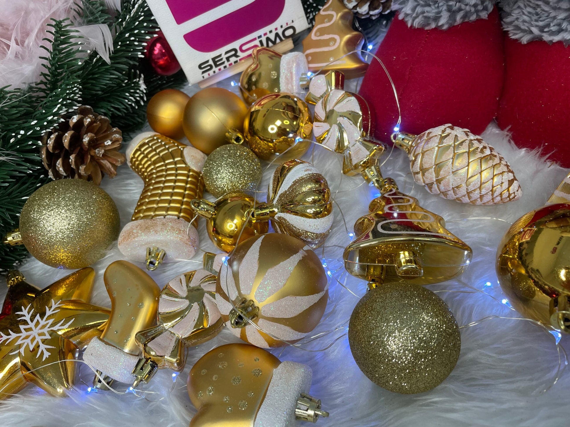 Set globuri si decoratiuni de Craciun, 77 piese, diverse dimensiuni, auriu